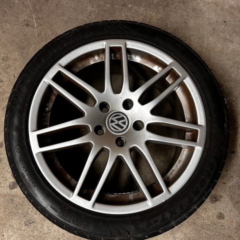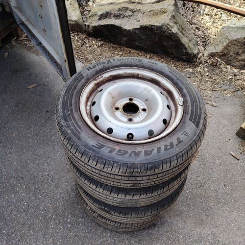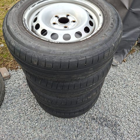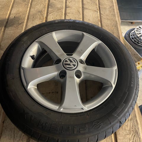 6 dekk og felg til vw Caddy. Passer mye vw. Ikke mye spor men får vel en sesong eller to ut av de