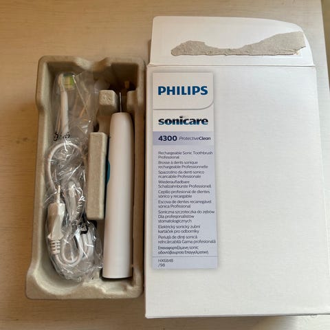 Medfølger original eske, ladeglass og ladekabel, samt ekstra tannbørstehode.
