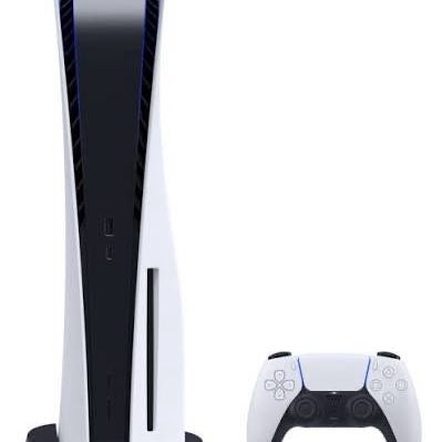 Sony Playstation 5 spillkonsoll i hvitt og svart. Konsollen støtter spill i høy oppløsning og har innebygd lagring, trådløs tilkobling og flere porter for tilkobling av tilbehør. Egnet for bruk med kompatible PS5-spill, digitale tjenester og mediemuligheter som tilbys via Playstation-plattformen.