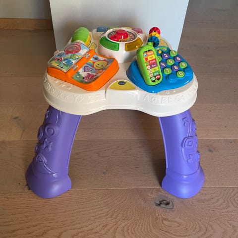 Vtech aktivitetsbord for barn. Bordet har flere fargerike aktivitetsflater med knapper, bokside, talltastatur og andre elementer som kan trykkes og vris på. Utformet for små barn som kan stå eller støtte seg mot bordet. Egnet som lekebord innendørs. Lyd og alt fungerer. Ny pris er 649,- på extra leker