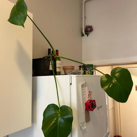 Monstera deliciosa potteplante i grønn farge. Planten har store, flikete blader og er plassert i en potte med klatrestøtte. Egner seg som inneplante i hjem eller på kontor. Trives vanligvis i lys til halvskygge og med jevn vanning uten at jorden blir gjennomvåt.