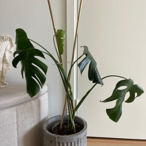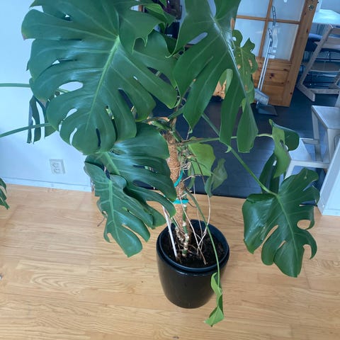 Monstera deliciosa med hvit plastpotte og mosepinne