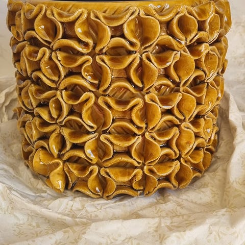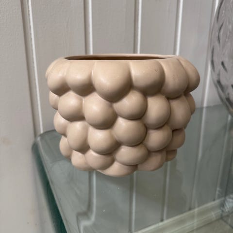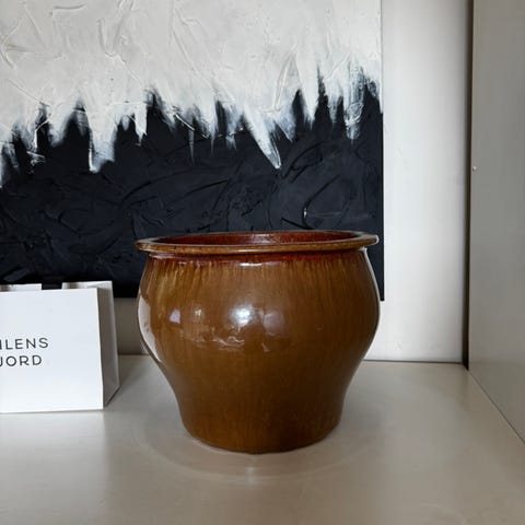 Kremmerhuset blomsterpotter i brun glasert keramikk. Pottene har en boblete, strukturert overflate og bølget kant øverst. Egner seg til innendørs bruk som potteskjulere til mindre planter. Selges som sett med to like potter.