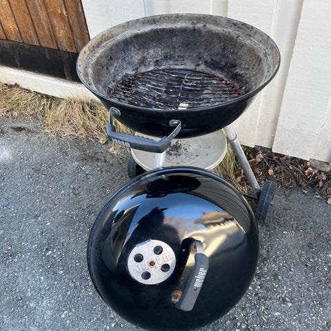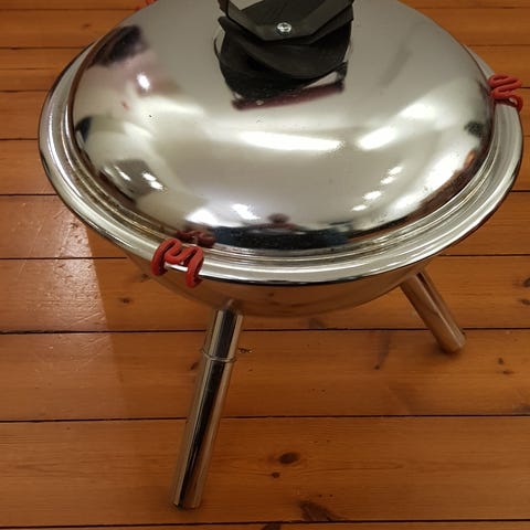 Rund kullgrill på stativ i metall. Grillen har enkel grillrist og trebeint understell som gir stabilitet på terrasse eller uteplass. Egnet til grilling av mat over kull eller briketter. Passer for bruk i hage, på veranda eller andre utendørsområder der det er tillatt å grille.