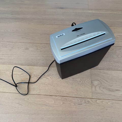 Olympia PS 43 CC makuleringsmaskin i svart og grå utførelse. Elektrisk makuleringsmaskin egnet for makulering av papir i hjem eller mindre kontor. Toppdel med kontrollknapper for start, stopp og revers, samt papirmating fra oversiden. Avfallsbeholder i plast under maskinen for oppsamling av makulert papir. Strømledning med vanlig støpsel for tilkobling til stikkontakt.