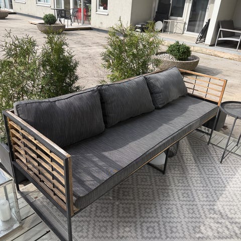Loungesofa Amsterdam Rusta med puter og bord, 1500kr. Ryggstøtte kan flyttes om man ønsker en annen vri på sofaen. Putene er løse og kan tas av for oppbevaring når de ikke er i bruk.