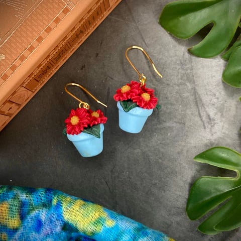 Håndlagde øredobber laget av polymer clay i blomsterdesign og med duggdetaljer i varm oransje. Sitter pent og gir et lekent statement til antrekket. Unikt smykke til flere forskjellige fester og arrangementer.