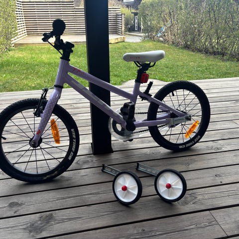 White barnesykkel med 16" hjul, turkis ramme med rosa felger og frontbremse Utstyrt med støtte. Noen bruksmerker, men alt fungerer som det skal. Hentes på Ryen.