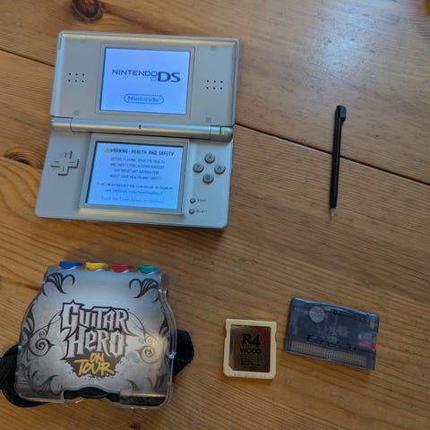 Selger en Nintendo DS NTR-001 med nytt shell da det gamle var knust. Knapper og batteri-luke fra original. Fungerer som den skal, hengslene er litt slappe mens den er lukket men ellers grei. Original lader og etui/veske følger med og et uoriginalt gameboy advance spill.