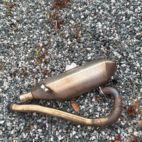 Eksosanlegg til lett motorsykkel med integrert lyddemper. Anlegget består av eksosrør, potte og varmeskjold i metall. Overflaten har noe slitasje og merker, men delene fremstår hele på bildene. Denne har søtte på en Yamaha mt 125 2016 modell og fungerer helt fint, har ingen skruer