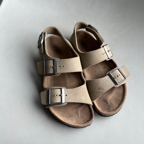 Glitrende sandaler fra Birkenstock i størrelse 33. Brukt på godværsdager i fjor sommer. Ser ingen stygge merker i oversiden av sandalen/i glitteret.