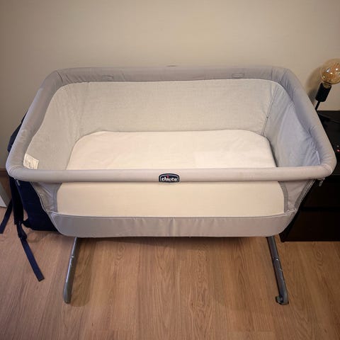 Chicco bedside crib babyseng i beige tekstil med metallramme. Sengen har nettingfelt i sidene for bedre luftgjennomstrømming og innsyn til barnet. Madrass, laken, tisselaken og sengetøy følger med.