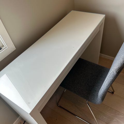 Helt og pent, solid skrivebord i glass. Oppbevaring under