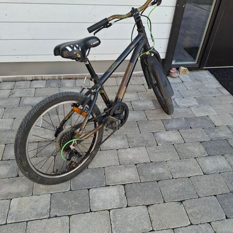 Sykkelen har 6 gir bak, skivebremser og dekk med grovt mønster som egner seg til bruk på både asfalt og grus. BakDekk er slitt stedvis.