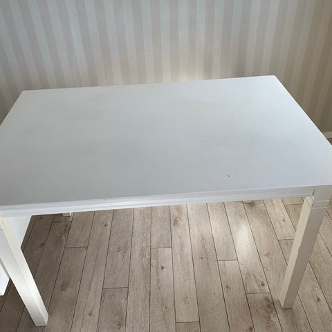 Bordet har en hel del riper og merken, men er helt og stødig og har masse bruk igjen. Kan nokk trenge et strøk med maling.