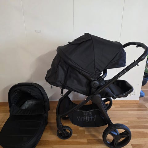 Yngri Ymer kombi barnevogn med både liggedel og sittedel i grå tekstil. Vognen har fire hjul, justerbart håndtak og stor varekurv under setet. Liggedelen brukes til spedbarn, mens sittedelen kan brukes når barnet blir større. Passer til daglig bruk på turer og transport av barn. Tekstilene fremstår i en nøytral gråfarge som egner seg for ulike behov. Regntrekk.