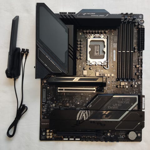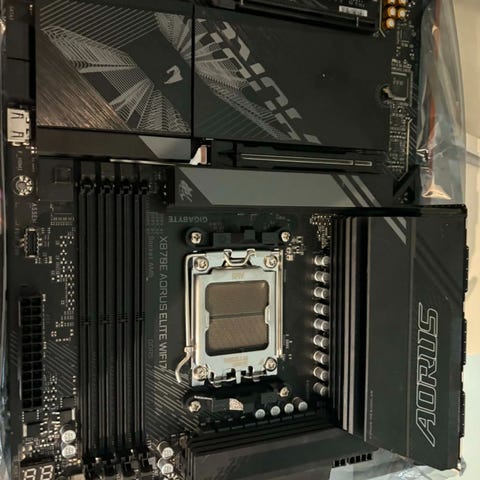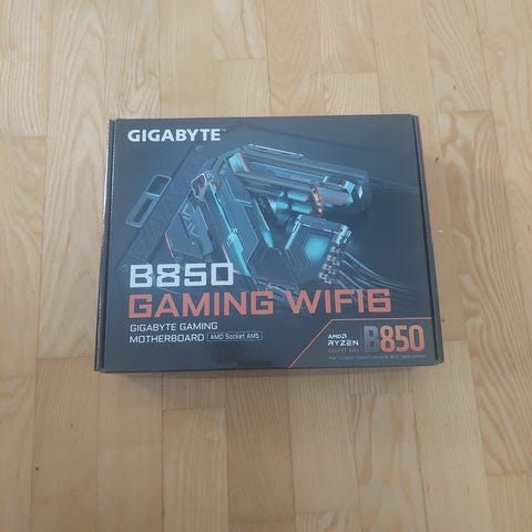 Hovedkortet har Am5 CPU‑socket, fire DIMM‑spor for DDR5‑minne og flere PCIe‑spor for skjermkort og utvidelseskort. Det har store kjøleribber over strømforsyning og M.2‑områder.