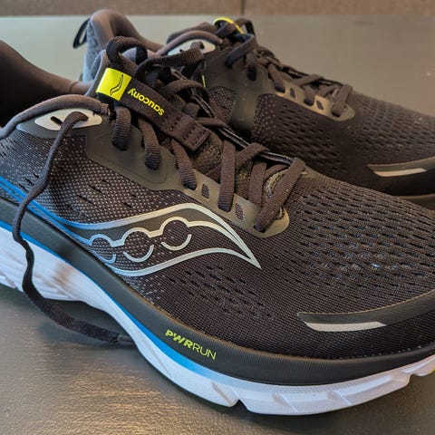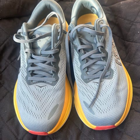 Hoka løpesko i størrelse 42. Skoene har grå overdel med oransje og hvite detaljer i sålen samt svarte lisser. Egnet til løping og annen trening der det er behov for joggesko med demping og støtte.
