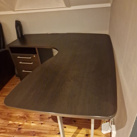 IKEA skrivebord i hjørneløsning i svart utførelse. Bordet består av rette og buede bordplater som danner en L-formet arbeidsflate. Det har gjennomføringshull for kabler i bordplaten og ben med metallunderstell. Egnet som skrivebord eller arbeidsstasjon i hjemmekontor eller andre arbeidsrom.