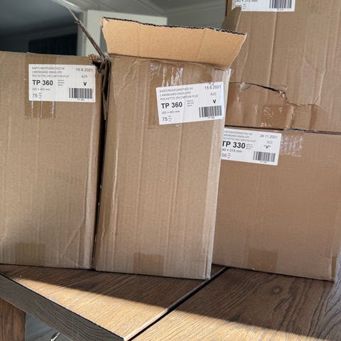 flytteesker i brun papp. Eskene er sammenleggbare og har bærehull på sidene. Egner seg til oppbevaring og flytting av ulike gjenstander i hjem, bod eller garasje. Flere esker i samme type og størrelse som vist på bildene. 100kr for alt.