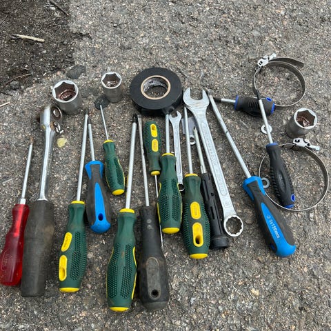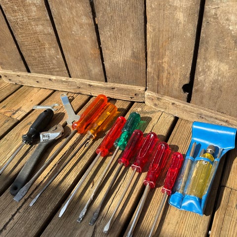 Bahco skrutrekkersett med flere ulike størrelser og typer skrutrekkere. Settet inneholder både rette (spor) og stjerneformede (Phillips) skrutrekkere, samt korte og lange varianter. Noe slitasje men fortsatt mye bruk igjen.