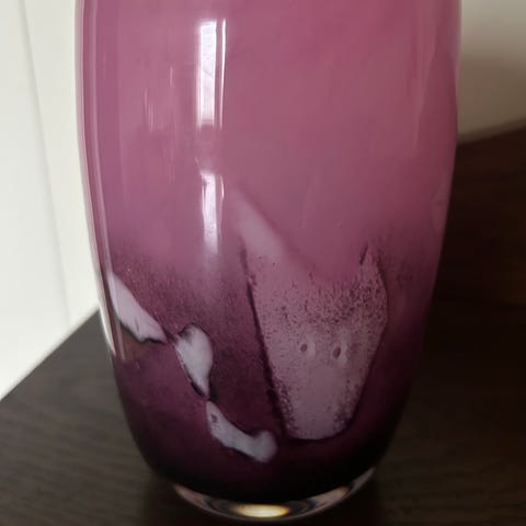 Mørk rosa/ lilla og hvit. Glatt og fin i overflaten