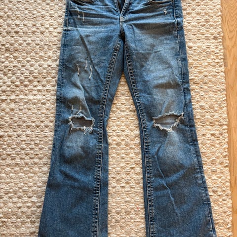 Gina Tricot jeans for jente i størrelse 152. Buksen er laget i blå denim og har klassisk femlommersdesign med baklommer med klaffer og knapp. Rett til svakt utsvingt benvidde. Lukkes med knapp og glidelås i front. Pent brukt!