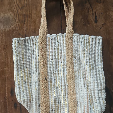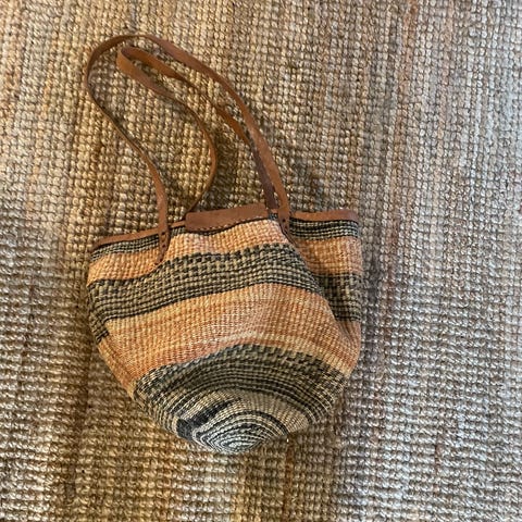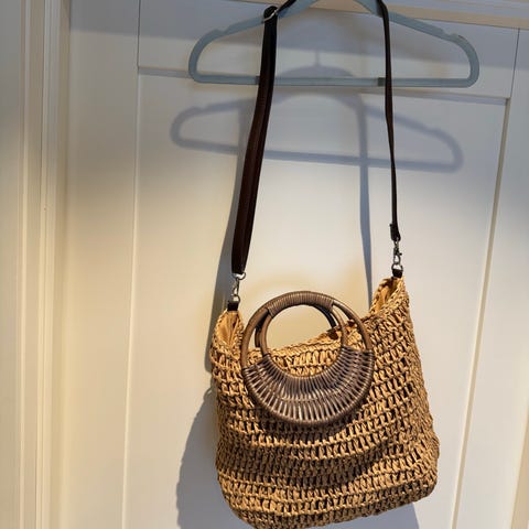 Zara veske i sisal for dame. Vesken har et flerfarget stripete mønster i naturtoner med blant annet beige, oransje og sort . Den har doble bærehåndtak og åpent hovedrom uten synlig lukking. Innsiden er uforet med samme stråmateriale som utsiden. Passer som hverdagsveske eller strandveske, og har god plass til personlige eiendeler.