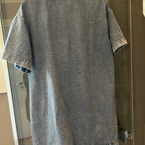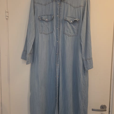 Lindex hverdagskjole i dongeristoff for dame i størrelse L. Kjolen er blå og har skjortekrage, lange ermer og hel knappestolpe foran. Den har to brystlommer og splitter i sidene nederst, som gir bedre bevegelse. Materialet er denim, som gir et robust og samtidig mykt uttrykk. Egner seg som hverdagskjole og kan brukes alene eller over bukse/leggings. Skjorten er helt ny og ubrukt, da den dessverre ikke passet i størrelsen.