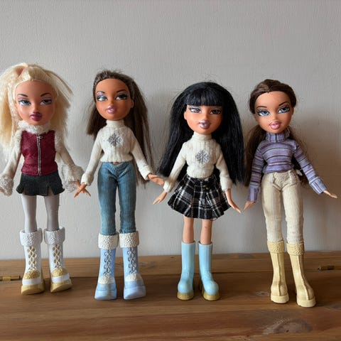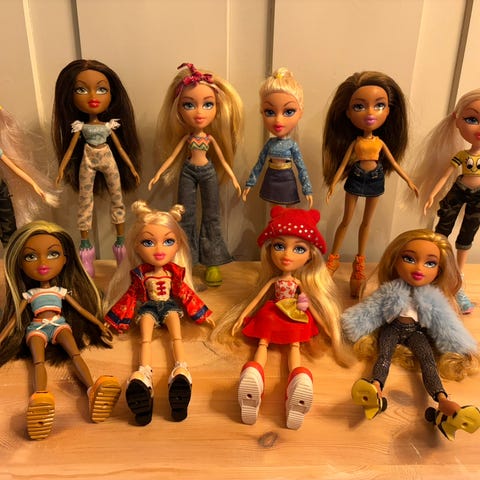 5 bratz dukker fra 1900 og 2000 tallet med litt tilbehør.