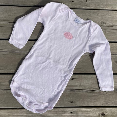 Petit Bateau body for baby i størrelse 74. Kortermet body i hvit bomull med lyseblått mønster. Unisex-modell med mykt materiale og trykknapper i skrittet for enkel av- og påkledning.