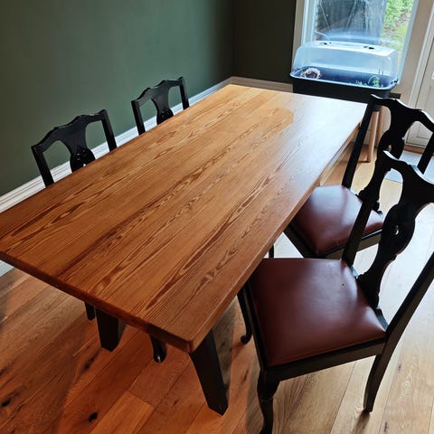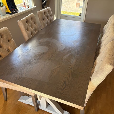 Spisebord selges på grunn av flytting. Bordet hadde originalt hvite føtter og er malt i fargen dempet sort, noe små slitasjemerker synes (se bildet). Bordet har noen hakk i overflaten men er lakkbeiset og fikset på slik at disse ikke er så markante lengre.