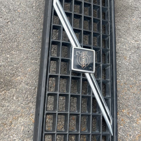 Volvo frontgrill i svart plast med kromfarget ramme og diagonal Volvo-logo. Passer til volvo 740 med. Grillen har vertikale ribber og er beregnet for montering i fronten av bilen som original erstatningsdel. Den er som ny bare litt skitten. Passet ikke min 940 front, derfor selger jeg den videre.