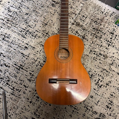 Ritmo 500 akustisk gitar i natur trefarge. Klassisk modell med nylonstrenger, tradisjonell hodeform med åpne stemmeskruer og rektangulær stol. Kroppen har lys topp og mørkere bakside og sider. Egner seg til generell akustisk spilling og øving, for eksempel til klassisk, vise- og fingerspill. Laget i Spania.
