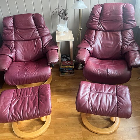 To eldre lenestoler gis bort til førstemann som henter. De er gode å sitte i, trenger en vask. Sikkert lurt å stramme litt også, men fungere fint.