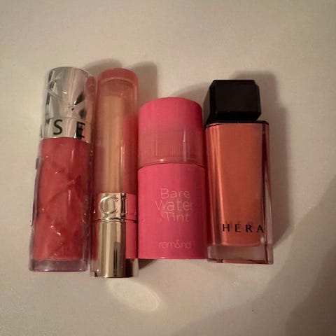Sett med fire ulike leppeprodukter i rosa og ferskenfarger. Maybelline Lifter Gloss i fargen 005 Petal er en lipgloss. Clarins Lip Perfector i fargen 07 er en leppeglans i tubeforpakning. Sephora Outrageous Plump Effect i fargen 07 er en plumpende lipgloss på 6 ml. e.l.f. Tinted Lip Balm Peach er en farget leppebalsam i ferskentone.