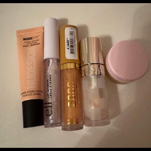 Maybelline Lifter Gloss 005 Petal, Clarins Lip Perfector 07, Sephora Outrageous Plump Effect 07 og e.l.f. Tinted Lip Balm Peach leppeprodukter.