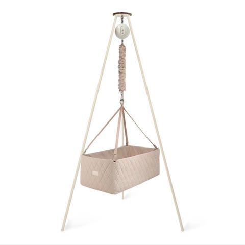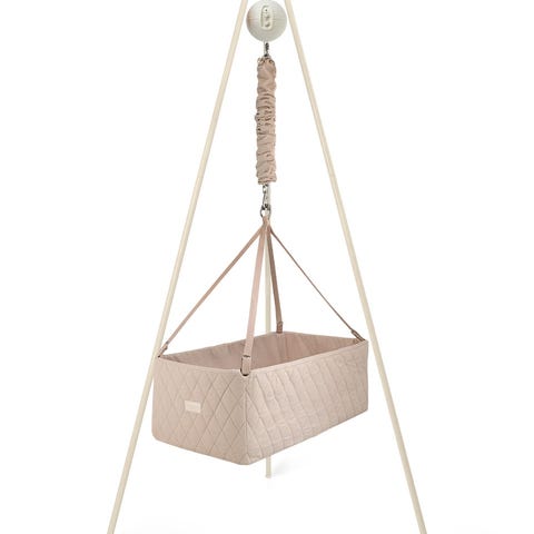 Moonboon med stativ for baby i beige tekstil. Vuggen henger i remmer fra et frittstående stativ med tre ben, og har rektangulær liggedel. Tekstiltrekket er i lys beige farge med quiltet mønster. Øverst er det fjær/oppheng som gir vuggende bevegelse. Egnet som soveplass for spedbarn i hjemmet. Kan plasseres fritt i rommet siden stativet er selvstående. Passer for baby i den første spedbarnsperioden, innenfor vuggens anbefalte vekt- og aldersgrenser fra produsent.