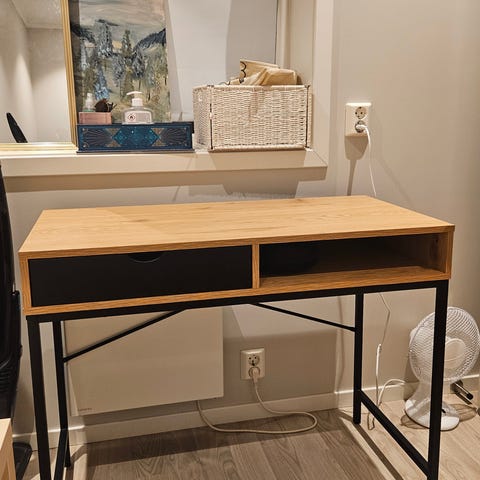 Gir bort pent brukt skrivebord fra jysk. Lite merke på skuffen, men ellers fin stand.