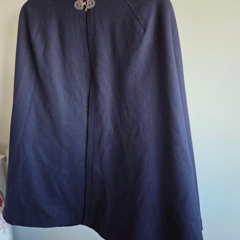 Kappen har skulderslag og folder bak, samt rødt fôr på innsiden som gir en tofarget effekt når den er åpen. Lukkes foran i halsen.