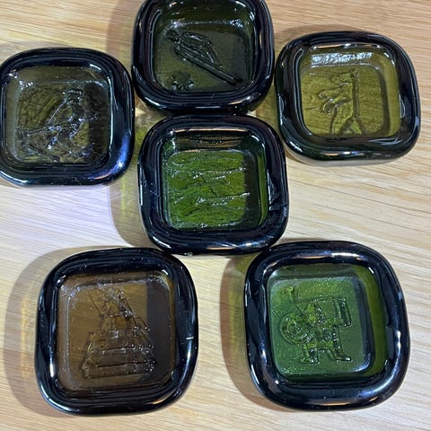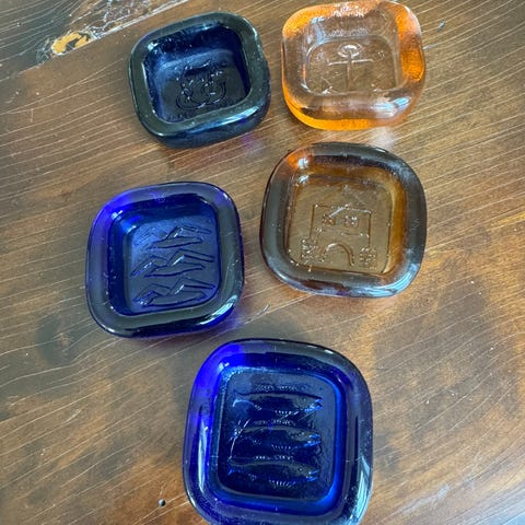 små Kunstglass med forskjellige motiv , askebeger ca 9x9 cm den store typen , kr 150,- stk. Kunst glass