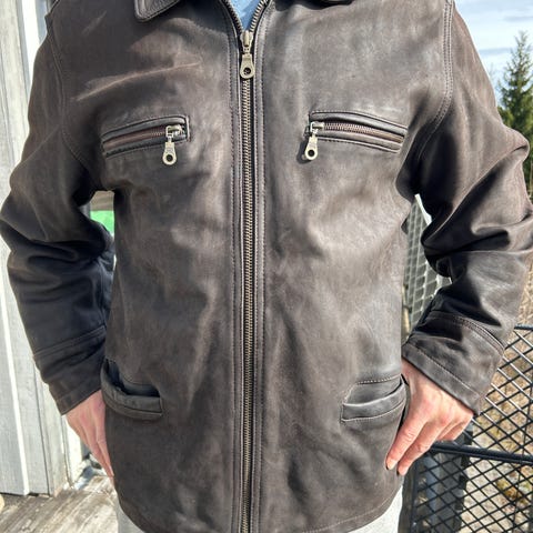 Be Edgy Berlin bomberjakke i vegetabilgarvet lær (vegetable tannet leather). Vegetabilgarving betyr at læret er garvet uten kjemikalier — det utvikler unik patina over tid og blir bare penere med bruk. Tobakksbrun farge med naturlig fargevariasjon som er en del av materialets karakter. Bomber-snitt med strikket ribbing på krage, mansjetter og kant. Armerlomme med glidelås og military-nitter på ryggen. Str L. God brukt stand — naturlig patina, ingen sprekker, hull eller flekker.
