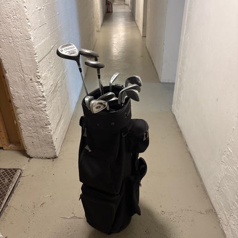 Komplett sett med køller fra Dunlop DMC-serien, inkludert woods, putter og jernkøller. Bagen har bærestropp og lommer for oppbevaring av tilbehør. Passer bra for nybegynnere