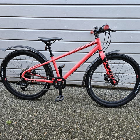 Sykkelen har grønn ramme og er utstyrt med rette styre, girbetjening på styret, skjermer bak og foran samt standard barnesete. Passer til barn som trenger en sykkel med 24-tommers hjul til hverdagsbruk og sykling på vei og lett grus.