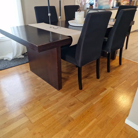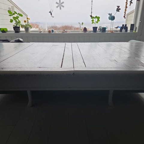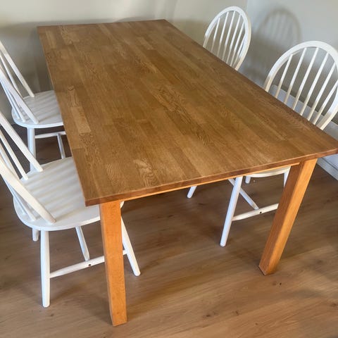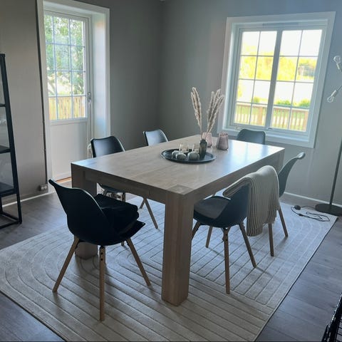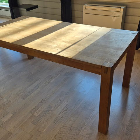 Bordet har noe slitasje etter flere års bruk. Bordplaten er hel og pen, men på hjørner, sider og bordbein er det noen hakk og riper. Beina kan skrues av. Bordet må hentes i Sarpsborg.