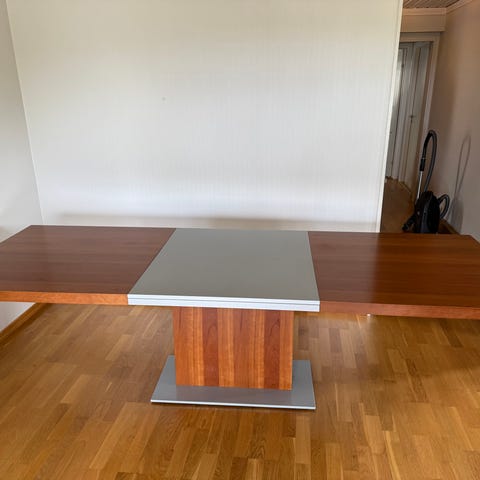 Bordet er 180 cm langt, 95 cm bredt og 78 cm høyt. I tillegg kommerto plater til å forlenge bordet. Disse er 95 x 47 cm hver.