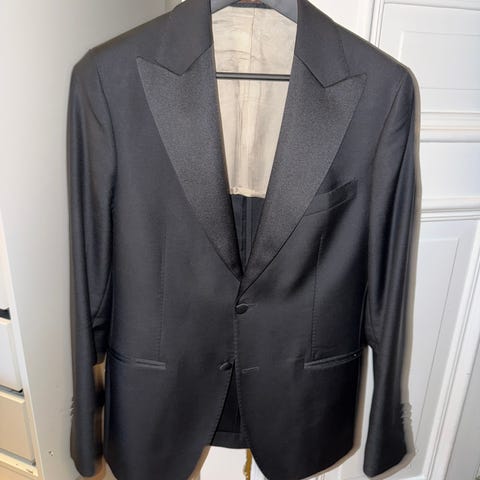Stilren smoking som sitter som et skudd! Både bukse og jakke er str 50.