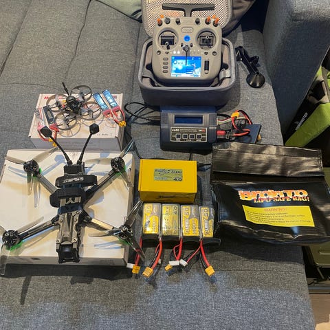 DJI FPV drone med grønt toppdeksel. Dronen leveres sammen med DJI FPV-briller og DJI fjernkontroll, som gir førstepersons visning under flyging. Liten skade på ene ben, men er ikke merkbart på noe måte ved flyving eller håndtering. Selges bare for det blir for lite brukt og andre burde få gleden av den.