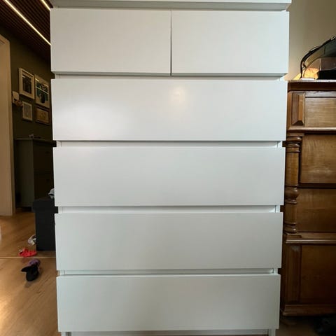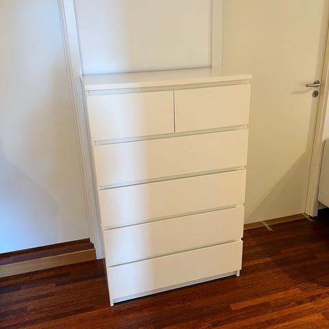 IKEA Malm kommode med flere skuffer i hvit farge. Kommode med totalt seks skuffer, hvor de øverste er mindre og de nederste er større. Overflatene er glatte med et enkelt og moderne uttrykk uten synlige håndtak. Passer til oppbevaring av klær, tekstiler eller annet i soverom. Må hentes