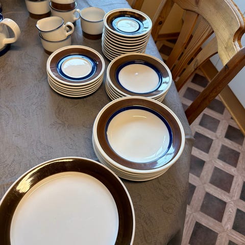 Selger et vakkert servise kjent for sitt klassiske blå/hvite uttrykk og tidløse design. Serviset er pent brukt og fremstår i svært god stand, uten synlige skader. Dette er kvalitetsporselen som varer i generasjoner – perfekt både til hverdag og finere anledninger.